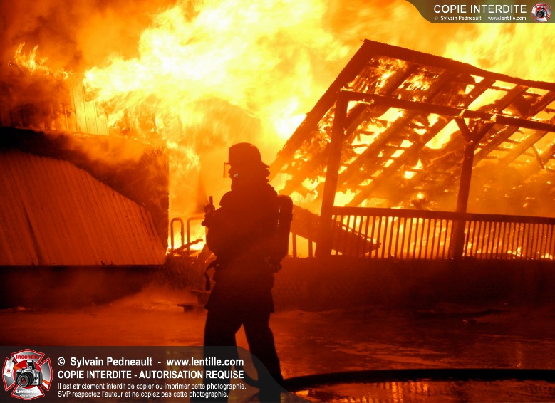 L'unité 205, encore à bonne distance du brasier, donne un 10-07 à la vue des flammes de plusieurs mètres de haut. Étant donné la perte évidente du bâtiment et l'absence de risque de propagation collatérale, une première alarme suffit à combattre le sinistre d'origine suspecte.